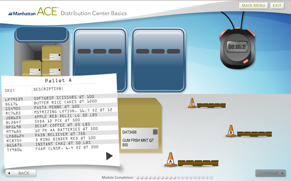 Manhattan Associates' award-winning e-learning provides the opportunity to take a virtual tour of a typical Distribution Center. In this course, learners not only "tour" a Distribution Center, they also “try out” the activities performed, and experience first-hand, the challenges to manual processes and benefits that Manhattan's software-enabled optimization provides. Through the tour, learners meet with people who work in the Distribution Center and experience how they are motivated. To accomplish this, a series of mini learning events build around each stop on the tour.